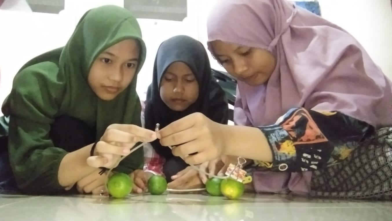 Rismawati Ramadhani, seorang guru dan fasilitator Tanoto Foundation merancang pembelajaran menarik dengan membuat baterai buah sebagai sumber energi listrik dalam kelas IX MTsN 2 Asahan, listrik...
