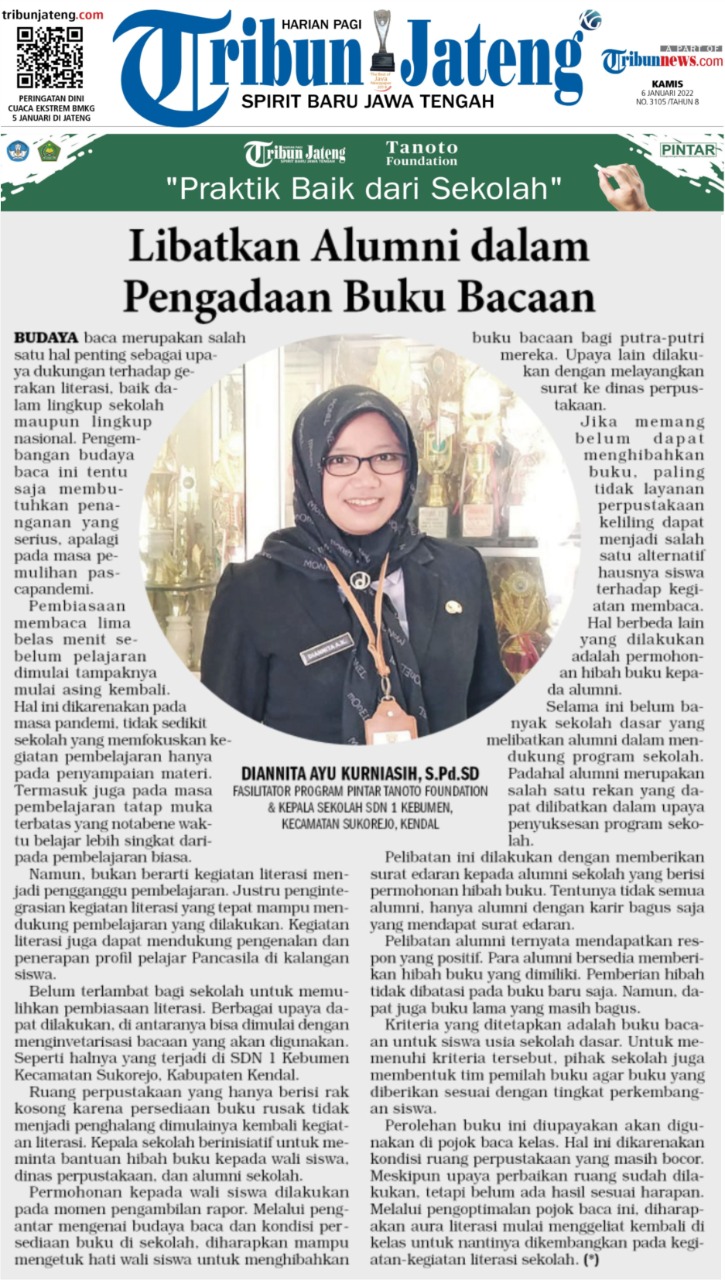 Artikel ini ditulis oleh Diannita Ayu Kurniasih, S.P.d. SD, Fasilitator Program PINTAR Tanoto Foundation dan Kepala Sekolah SDN 1 Kebumen, Kecamatan Sukorejo, Kendal. Diannita mengajak alumni sekolah SDN 1 Kebumen untuk menghibahkan buku bacaan dan terlibat dalam upaya penyuksesan program sekolah.