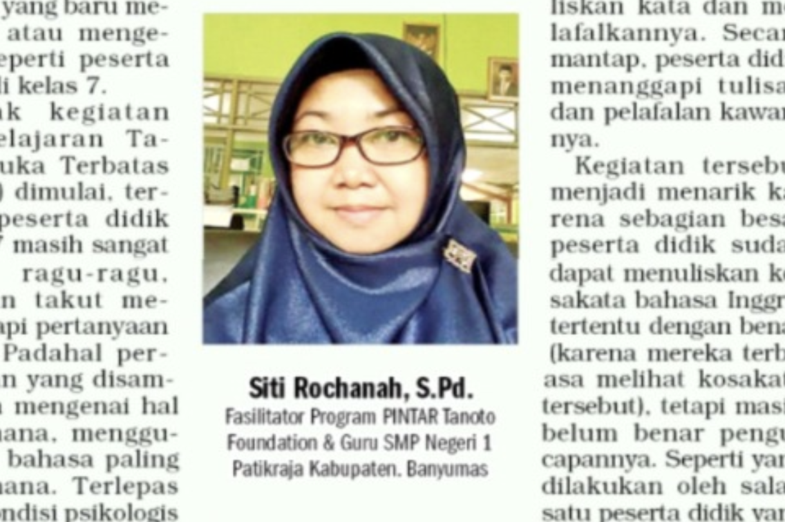 Siti Rochanah, SPd, guru SMP Negeri 1, Patikraja Kabupaten, Banyumas, mengajarkan siswanya bahasa inggris dalam kegiatan sehari-hari agar siswanya dapat dengan mudah menghafal dan terbiasa...