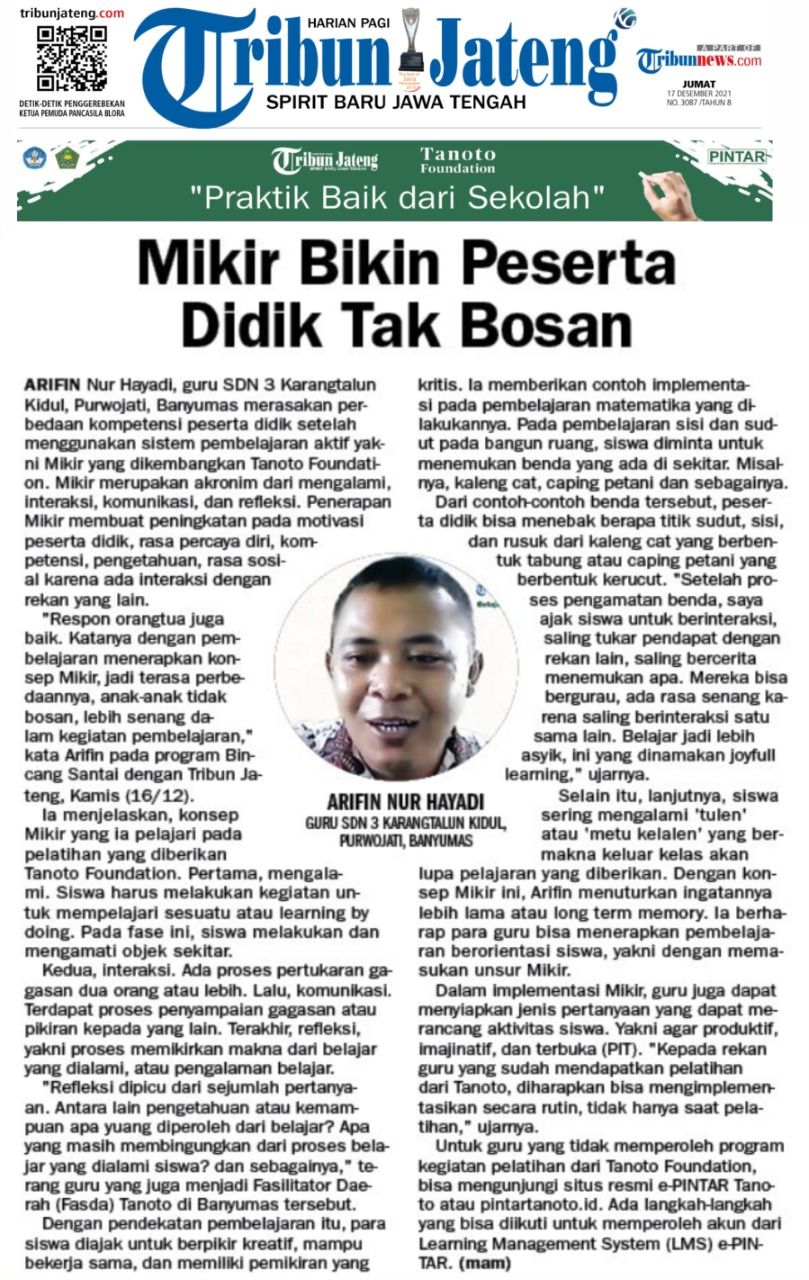 Arifin Nur Hayadi, guru SDN 3 Karangtalun Kidul, Purwojadi, Banyumas merasakan perbedaan kompetensi peserta didik setelah menggunakan sistem pembelajaran aktif yakni MIKiR yang dikembangkan Tanoto...